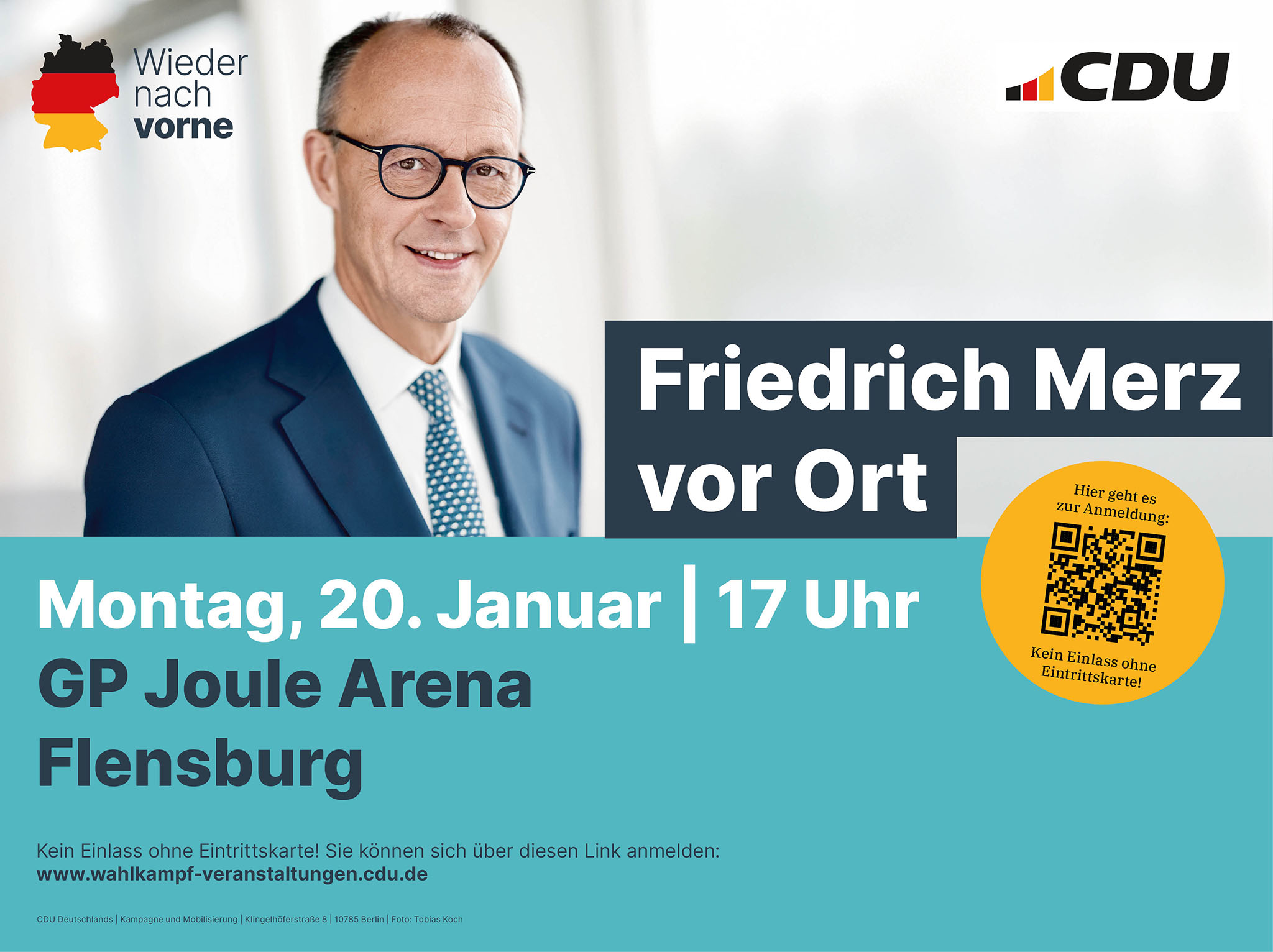 Kommen Sie zum Wahlkampfauftakt mit unserem Kanzlerkandidaten Friedrich Merz in die JP-Joule-Arena nach Flensburg (ehem. Campushalle).