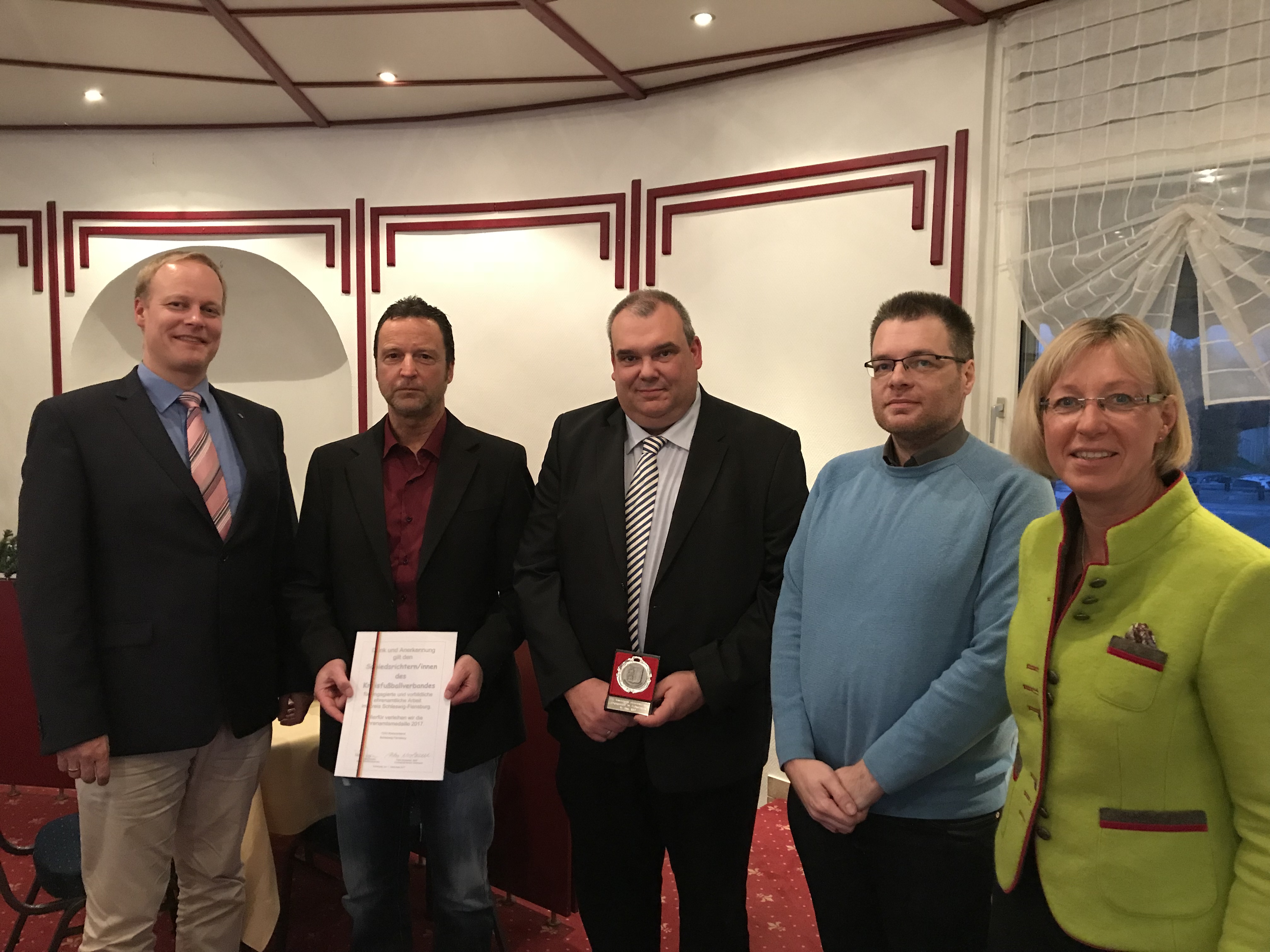 „Leider haben wir auf unsere Einladung seitens der beiden Kreishandballverbände keine Rückmeldung erhalten, so dass wir uns dennoch freuten, den Ehrenamtler des Kreisfußballverbandes unsere Anerkennung aussprechen zu können“, so die Ehrenamtsbeauftragte des CDU-Kreisverbandes, Petra Nicolaisen. Stellvertretend für rund 180 Frauen und Männer, die sich regelmäßig bei Wind und Wetter in den Dienst des Fußballsports stellen, erhielten der Vorsitzende des Schiedsrichterausschusses Christopher Polster sowie seine Kollegen Olaf Sulimma und Jens Stöben die Ehrenamtsmedaille und –Urkunde der Kreisunion, die in feierlicher Runde übereicht wurden.