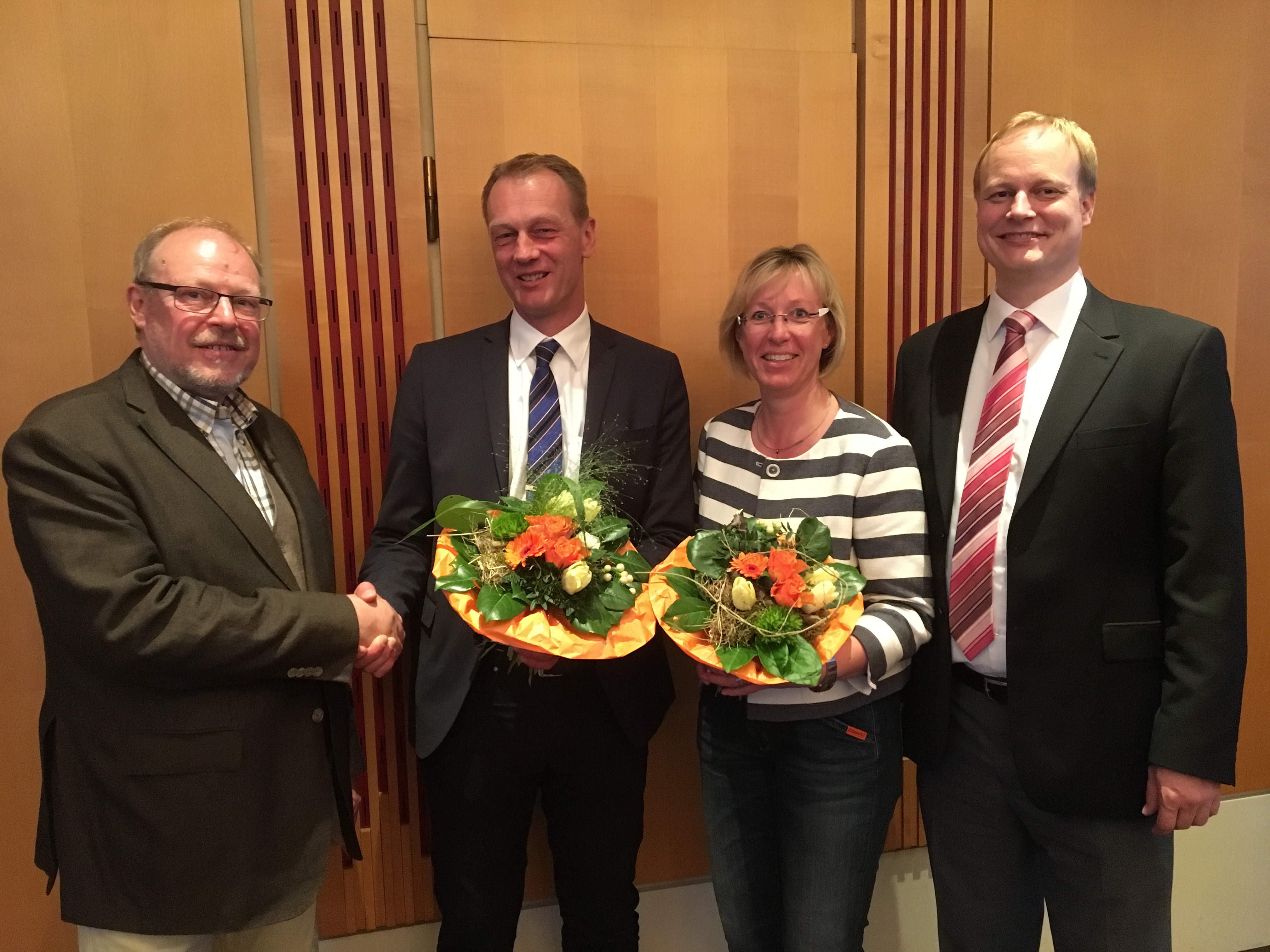 Fraktionsvorsitender Walter Behrens und stellv. Kreisvorsitzender Thomas Jepsen gratulieren Petra Nicolaisen und Johannes Callsen