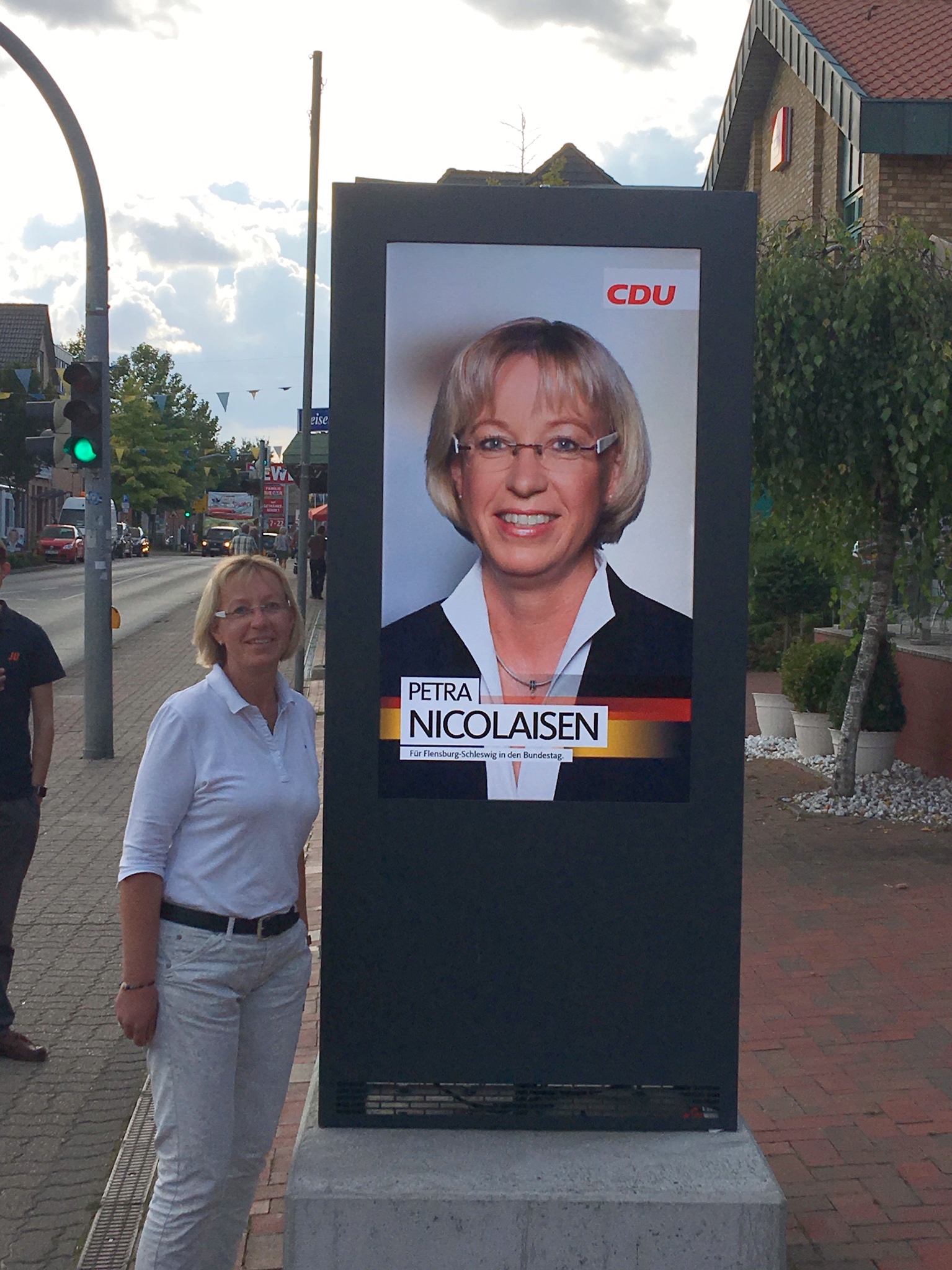 Seit wenigen Tagen werben wir nun auch auf den digitalen Werbeflächen in Flensburg und Süderbrarup für unsere Bundestagskandidatin und für den Wahlkampfauftritt der Bundeskanzlerin am 20. Sept. in Kappeln. "Diese Form der Werbung nutzen wir erstmalig, aber bereits nach einigen Tagen sind die Rückmeldungen ausschließlich positiv", so Petra Nicolaisen. "Das fast schon freundschaftliche Angebot der in Flensburg neu gegründeten Firma ad-on4you konnten wir nicht ablehnen und stellt eine tolle Werbung dar."
