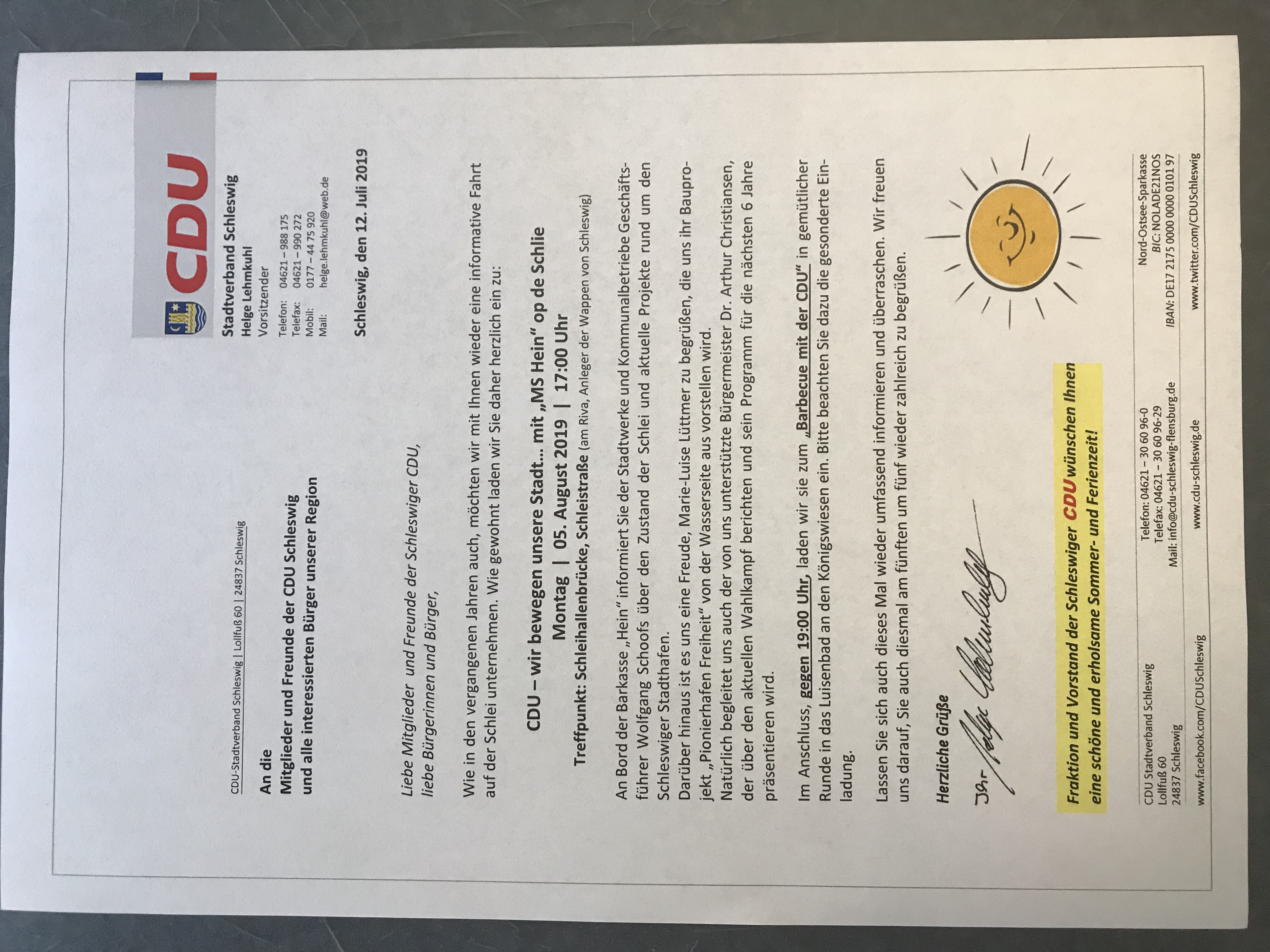 Unter dem Motto "Wir bewegen unsere Stadt" geht es mal wieder mit der "Hein" auf die Schlei, natürlich mit fachkundiger Begleitung (siehe Foto). Start ist am Bootsanlieger an der ehem. Schleihalle.